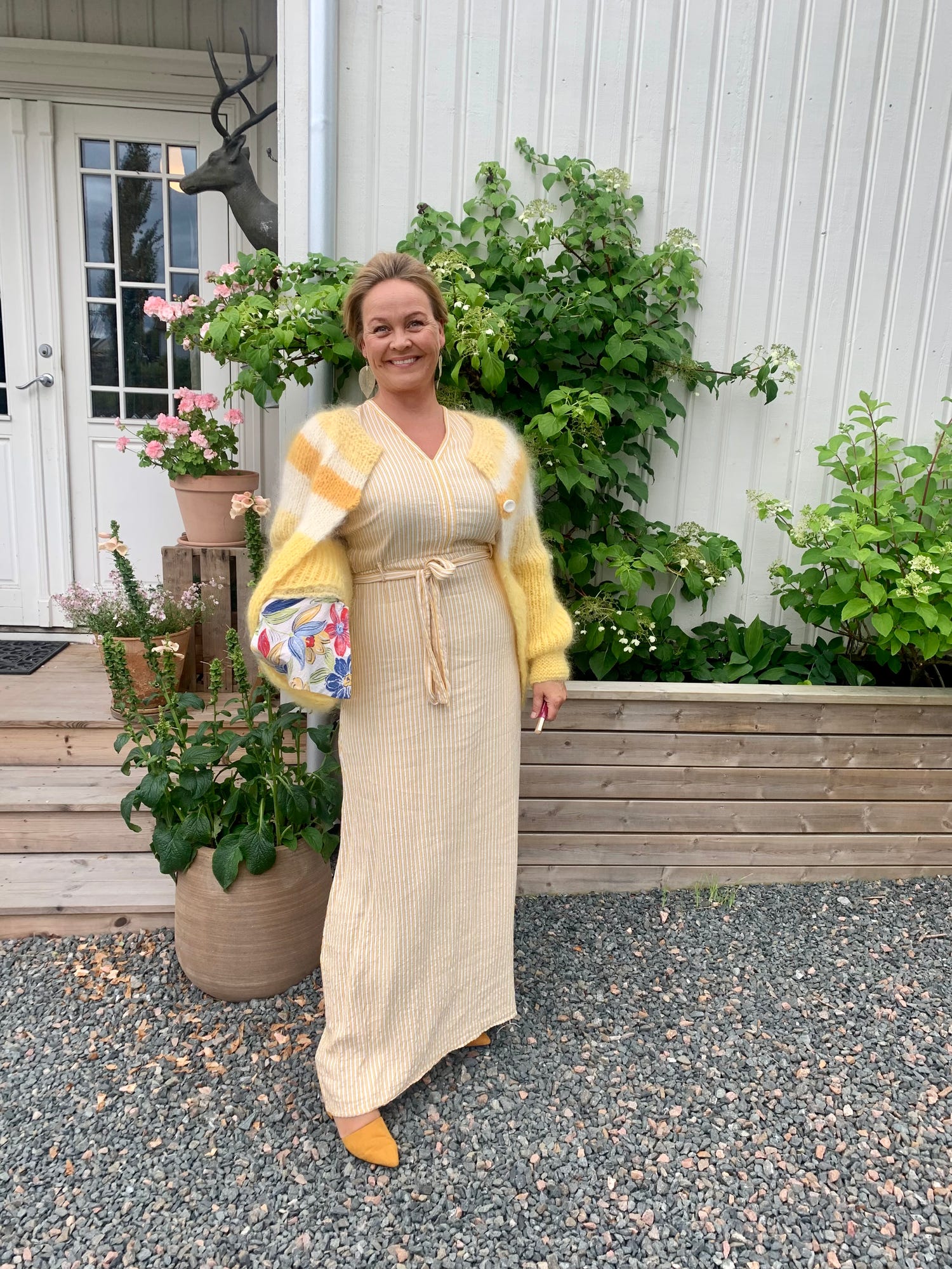 Glimpses of Glam - is a narrow-striped jumper knitted in a combination of Soft Peacock and alpaca. The jumper has a round neck, hole pattern and cuffs with buttons.