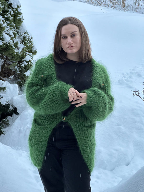 Designet i halvpatent med pufferme og rageland slag og krage, og er dekorert med vintage knapper, og lommer strikket som passpoilerte lommer.