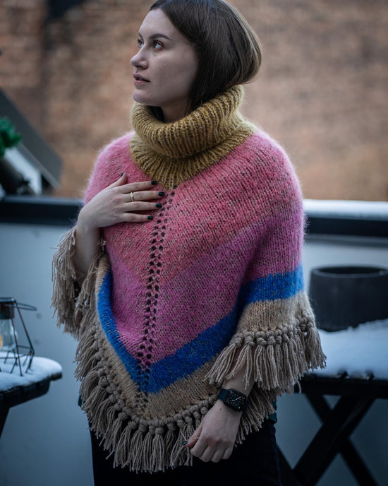 Buy knitting patternThe Pink Hour - is a knitting pattern for a short luxury poncho in colors taken from the magical pink hour. The poncho is designed to be used both outside and inside, and is knitted in a combination of gold, alpaca and mohair.