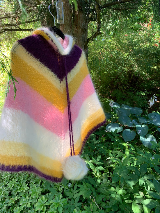 Adventure of a Lifetime - is a snuggly poncho designed in comfortable alpaca and gold. The poncho is knitted in garter stitch, and has a hood with a tassel.