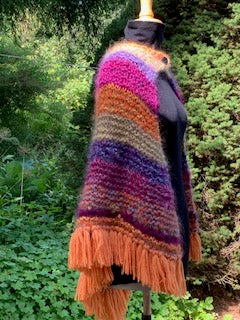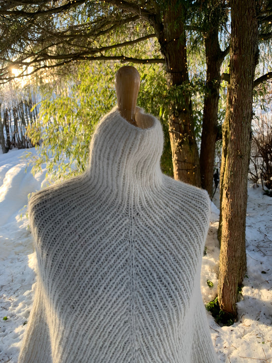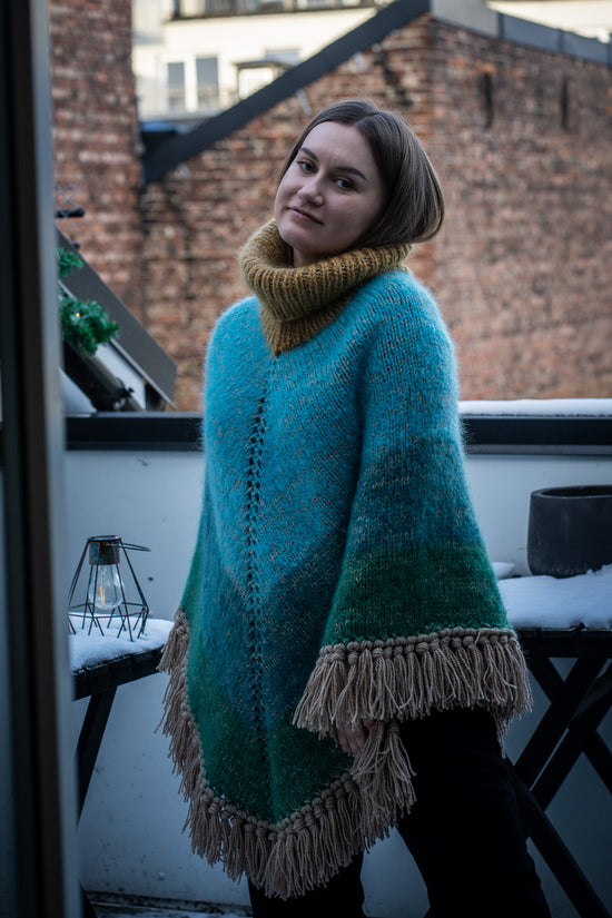 Buy knitting patternThe Magic Woods - is a knitting pattern for a long luxury poncho in colors taken from a magical untouched forest. The poncho is designed to be used both outside and inside, and is knitted in a combination of gold, alpaca and mohair.