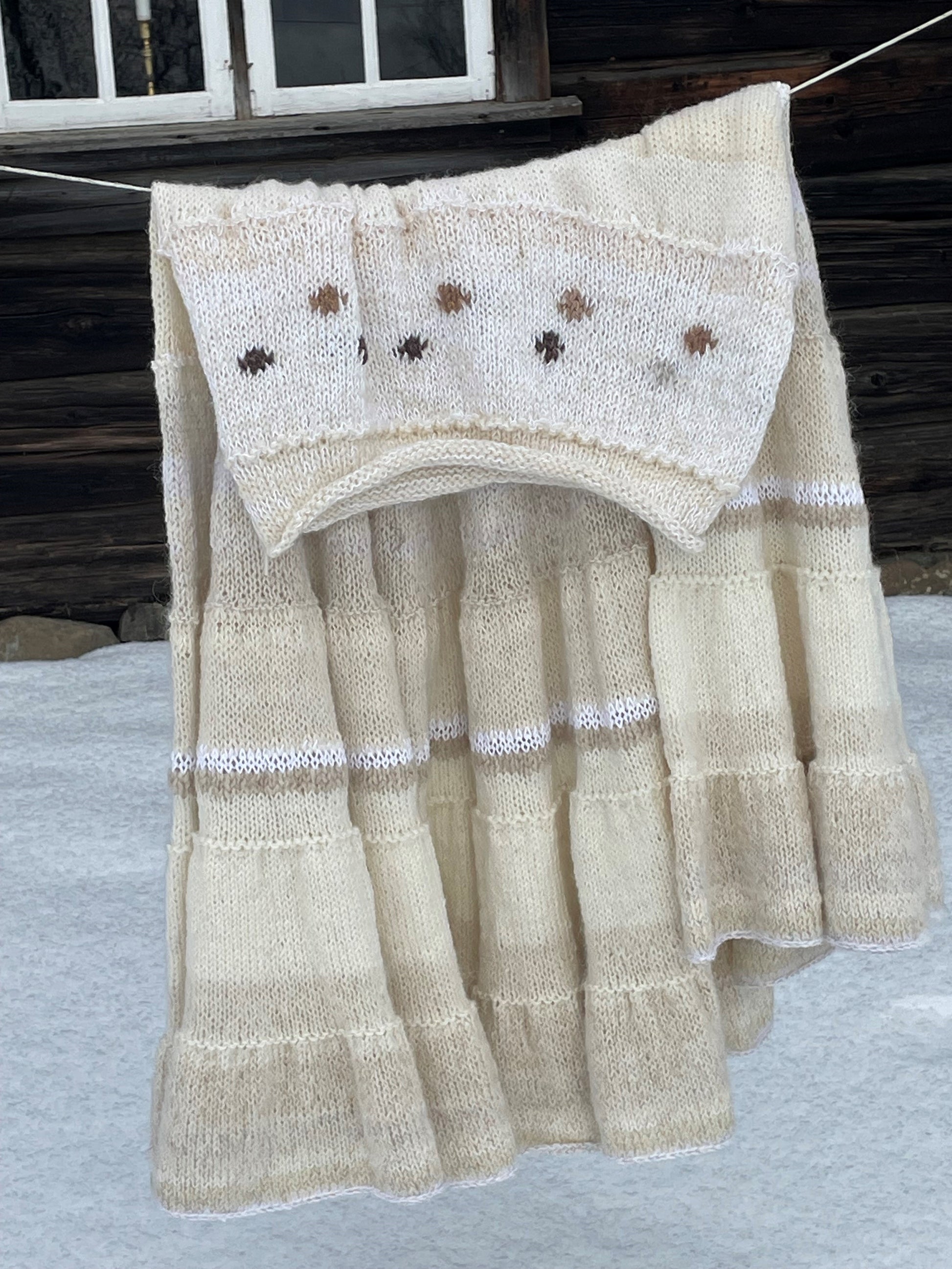 O - er designet med et feminint, mykt og fyldig fall, med hint av gull, og passer like perfekt brukt året rundt, enten med den hvite t- skjorta og sneakers en sommerkveld, eller pyntet opp med pels og silke vinter og høst. Siden O er et større strikkeprosjekt, så er O designet med knyting, slik at skjørtet blir tidløst og varig, og kan tilpasses ens ulike størrelser gjennom livet. Hvis du ønsker et større strikkeprosjekt, så anbefales dette 🤎