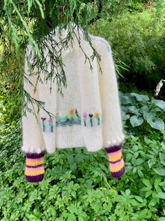 This one is made with loop stitches in pink mohair, and with several white stamens in the middle, embroidered with French knots. This one is embroidered with small leaves at the bottom, embroidered with chain stitches in green in variegated mohair from Bella by Permin.