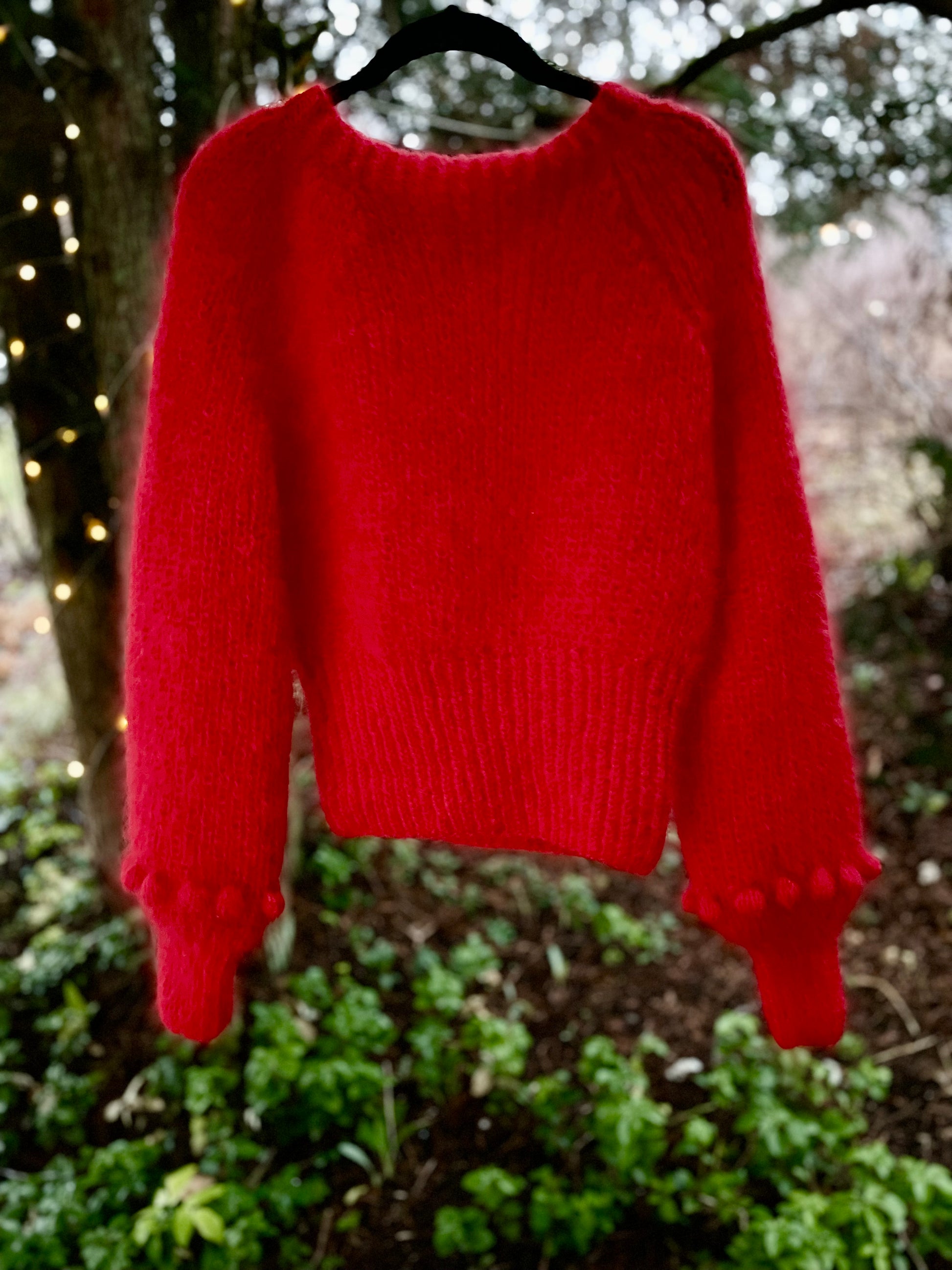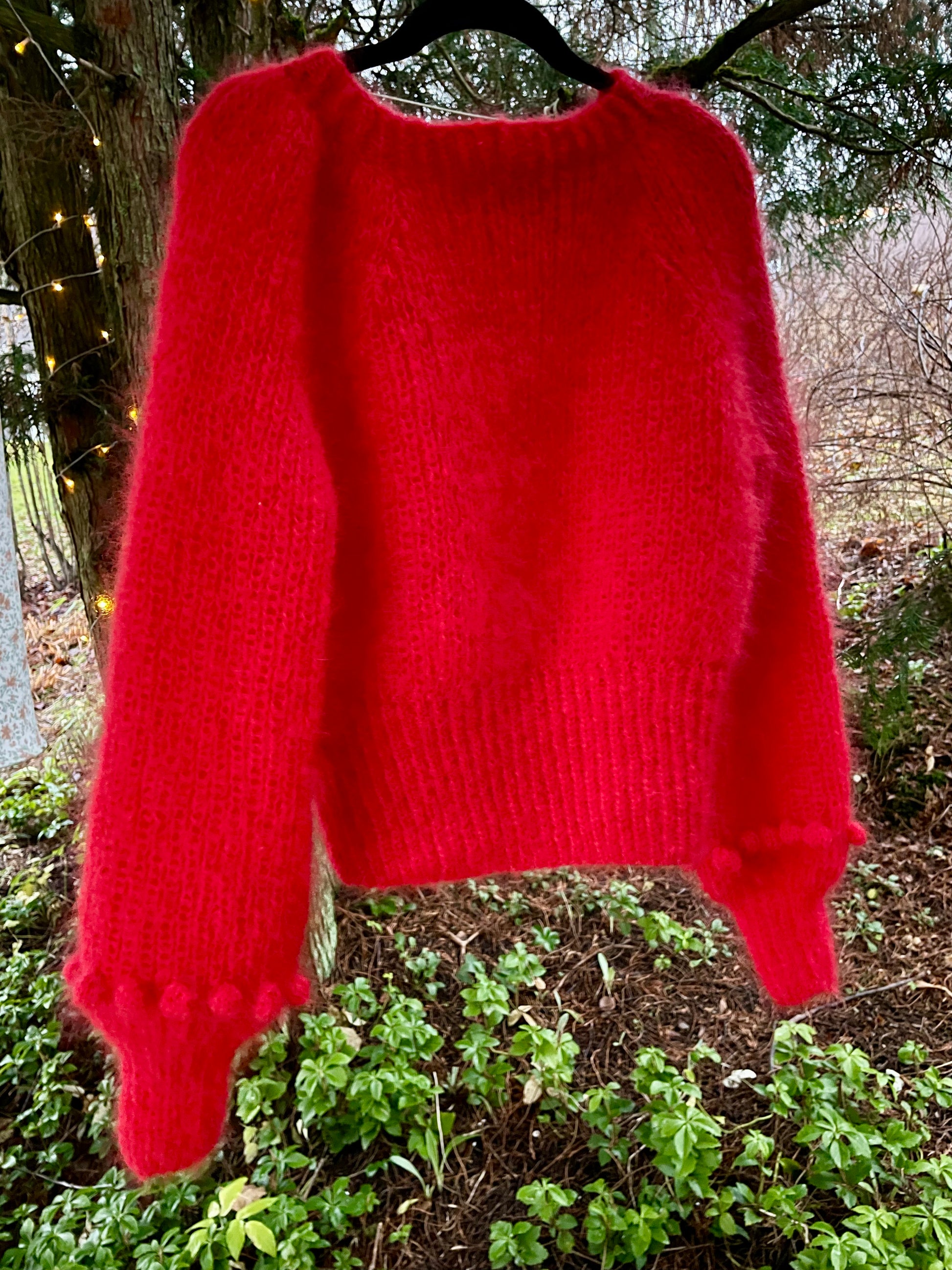 Christmas Please - er en strikkeoppskrift på en superklassisk og feminin halvpatent julegenser, med høyt liv og lange mansjetter. Genseren er designet med popkorn på erme og i to variasjoner: smal og vid båthals.