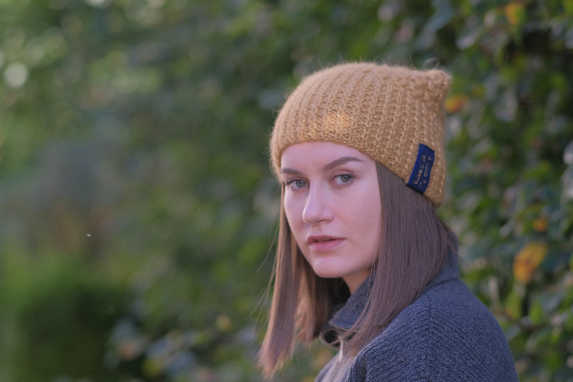 Golden Sky - is a beanie scarf designed in cable knit and gold thread. The scarf has a decorative vintage button in rhinestones. The scarf is designed to be buttoned at the back, under the chin, and worn unbuttoned at the back.