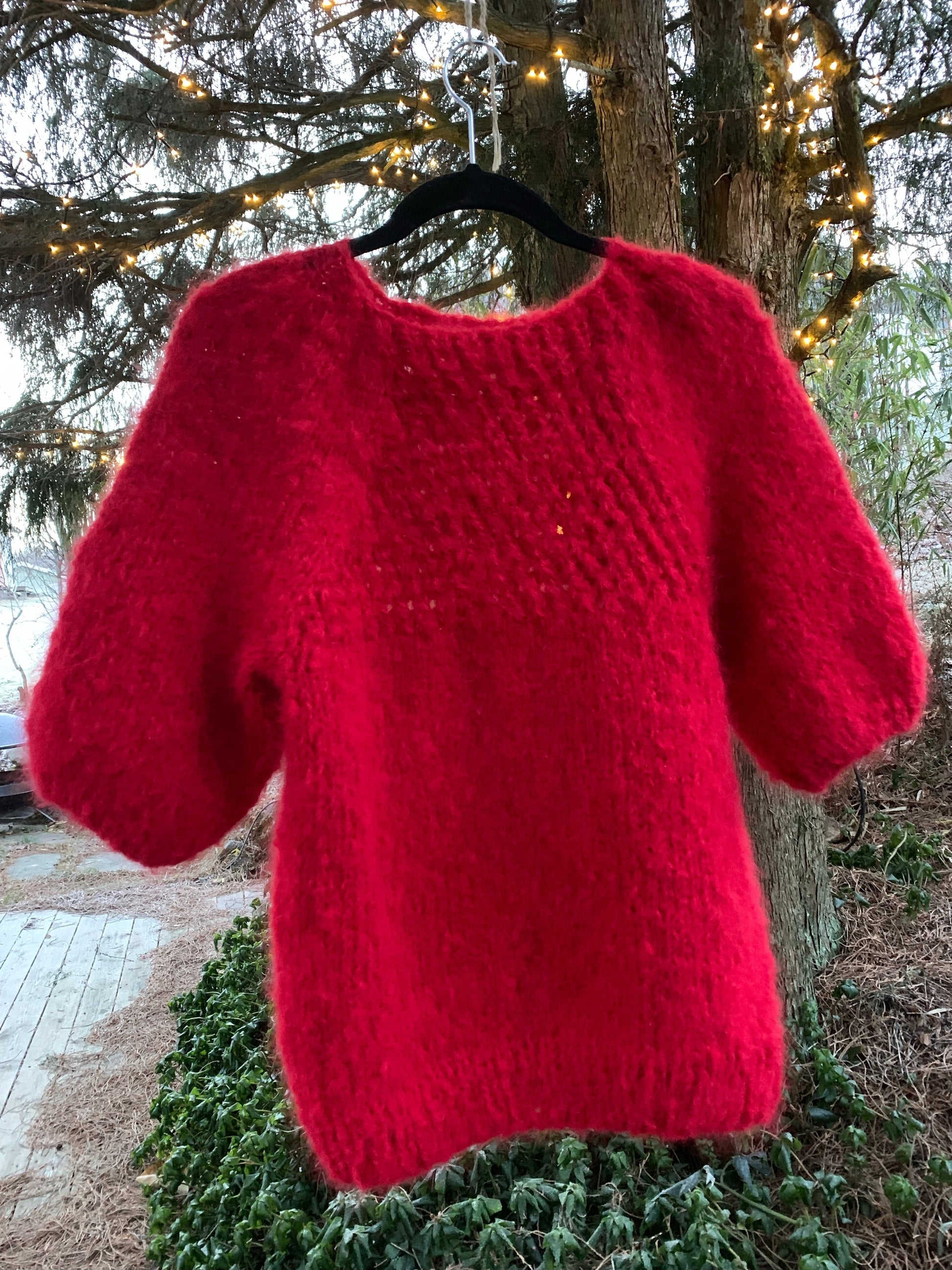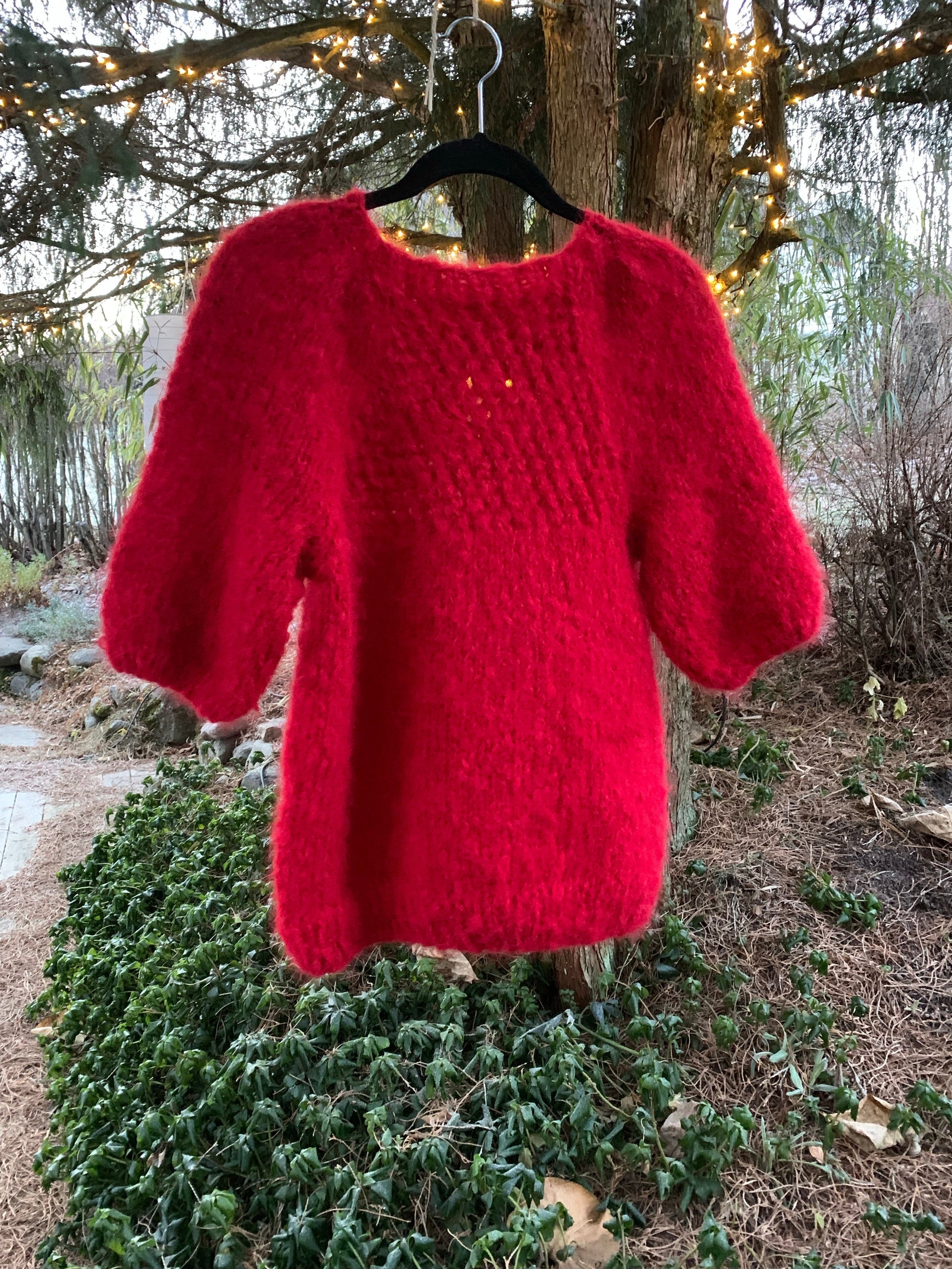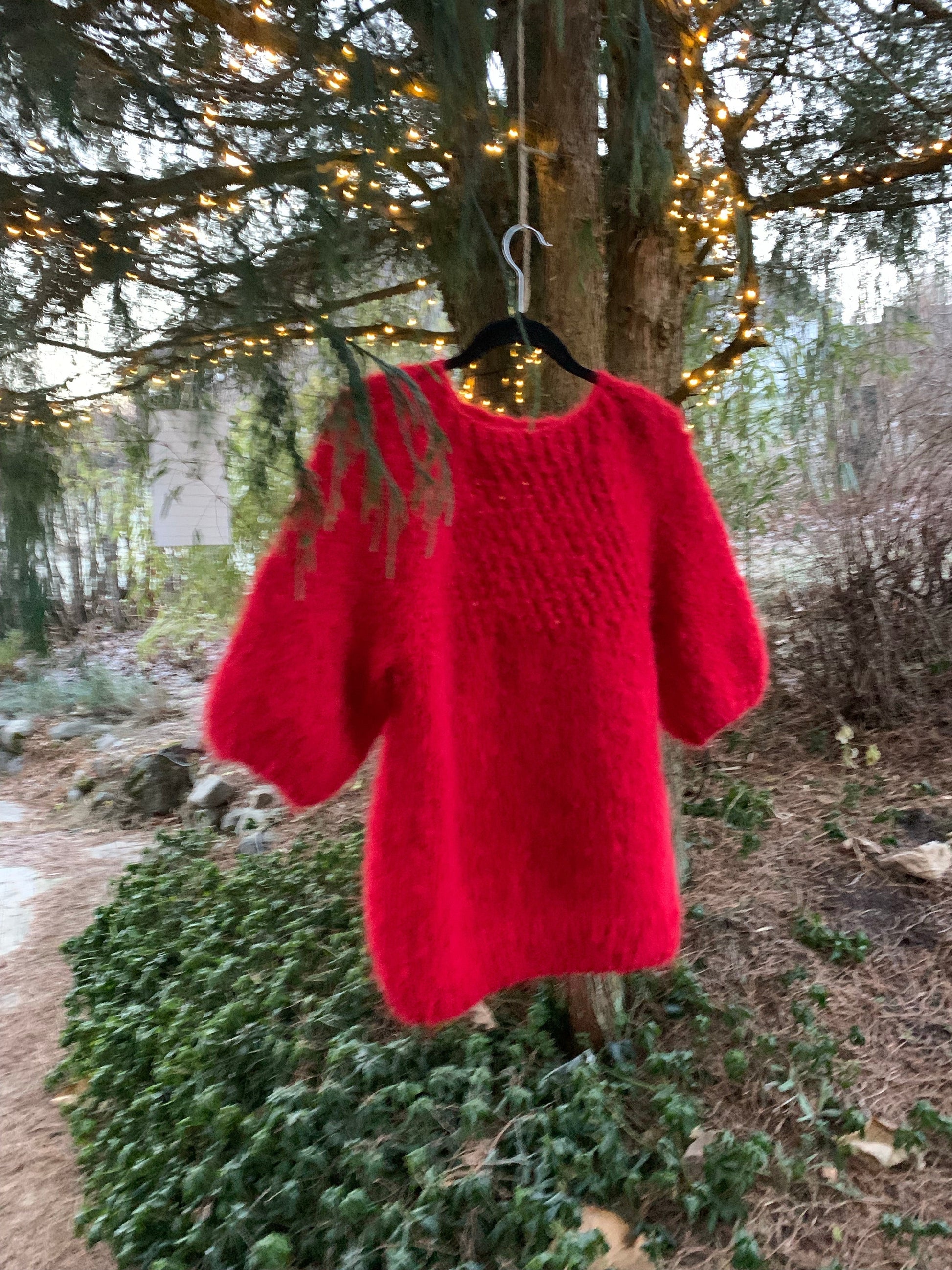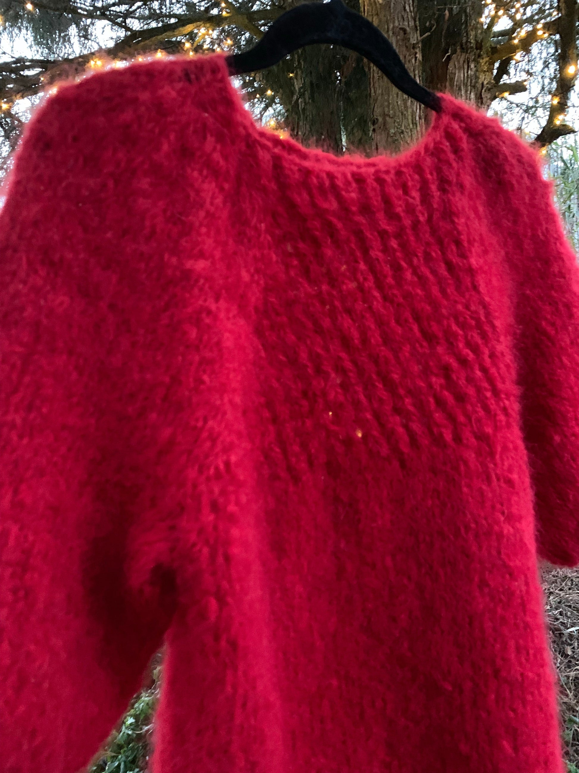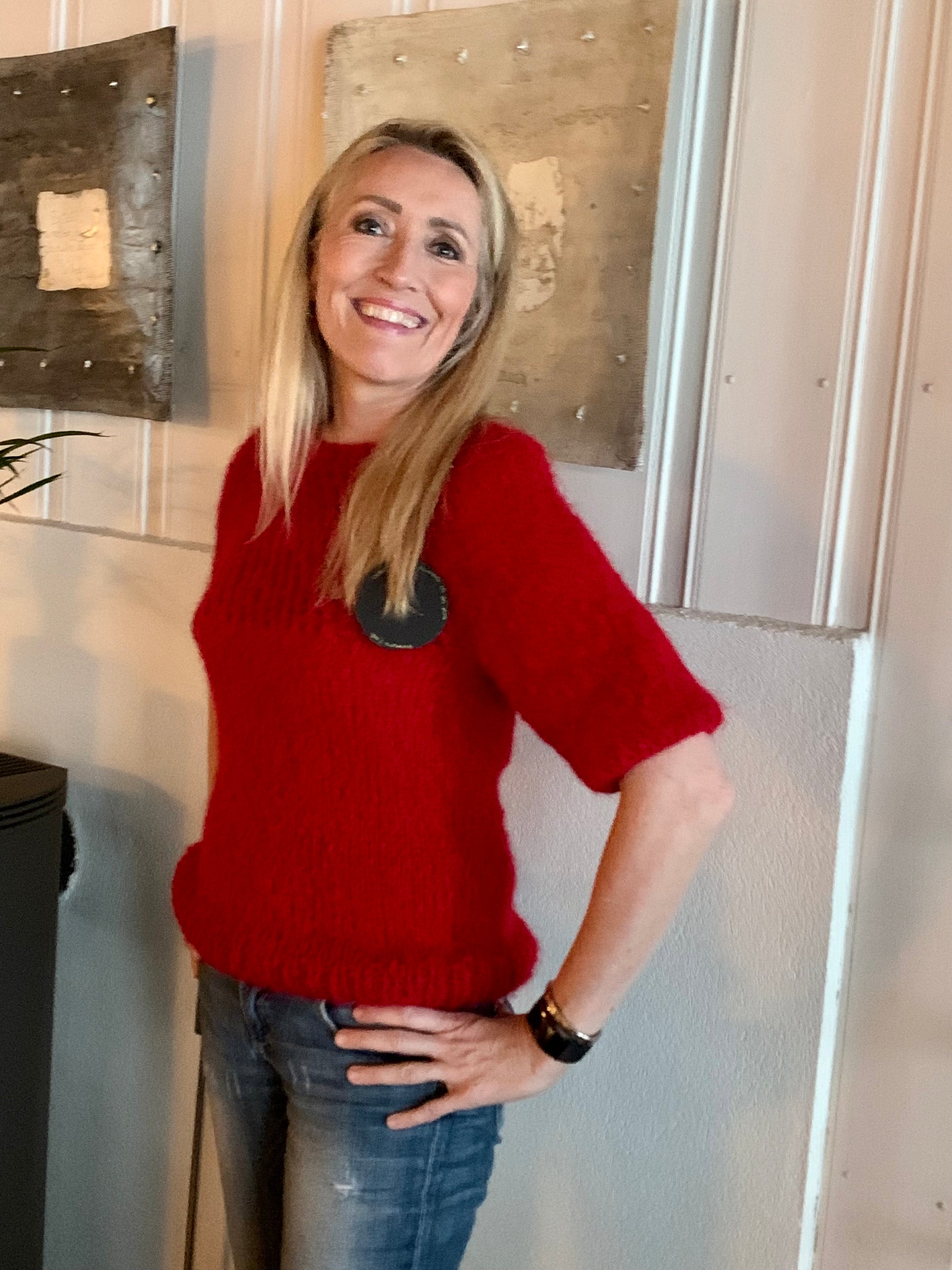 Christmas- is a light raspberry red sweater with semi-patent sleeves, hole pattern and boat neck. This is a model that sits super feminine and slim on the body. The sweater is meant to be worn directly on the skin, and is knitted in a non-itchy material. The hole pattern also means that the jumper does not feel too warm.