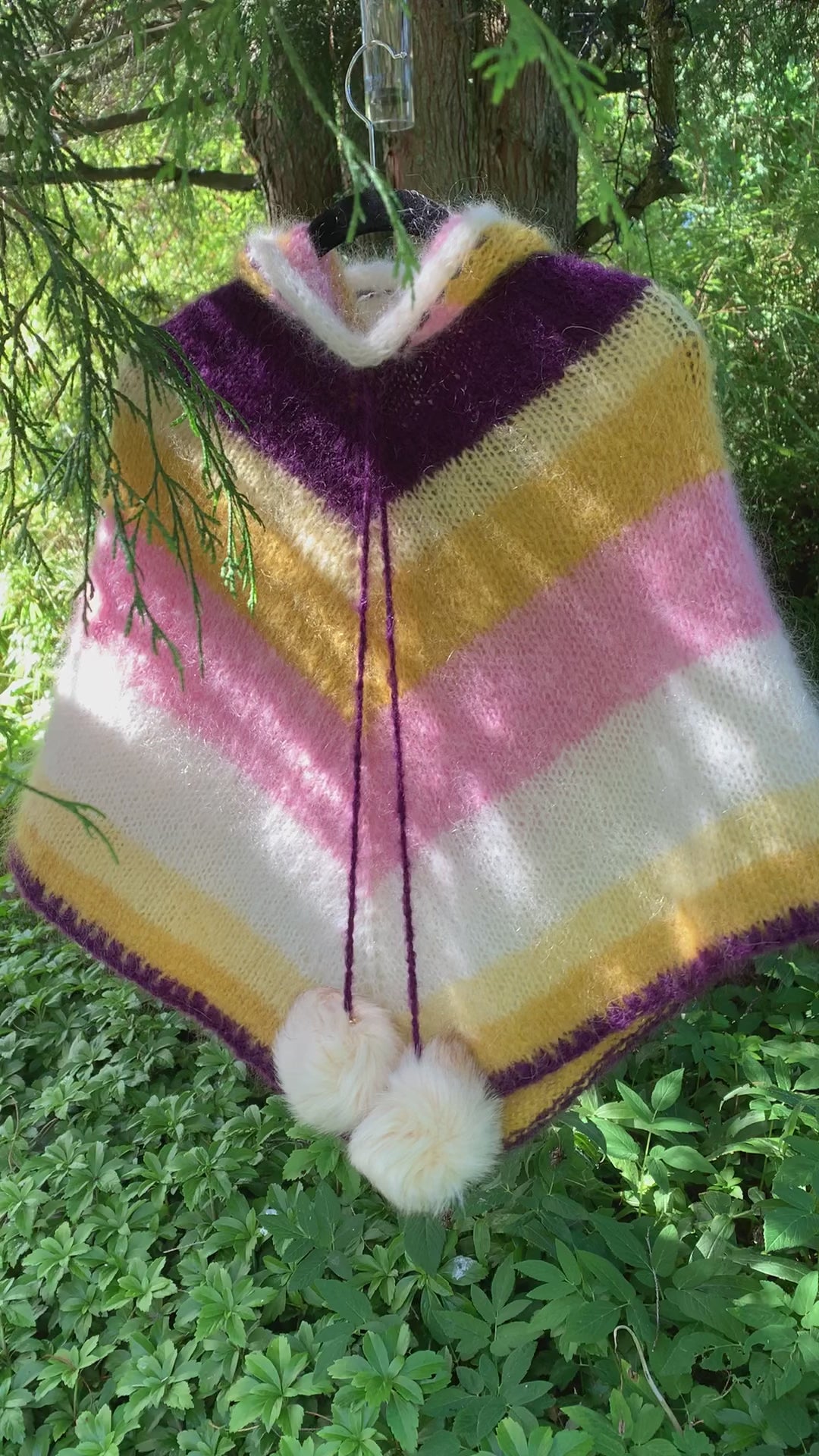 Little Miss Sunshine - is a knitting pattern for a children's poncho, designed in summer striped mohair, with a hood and tassels.